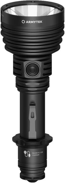 A legújabb Armytek Barracuda Pro Max hideg fehér fényű lámpa fantasztikus teljesítményével a cég kínálatának legerősebb tagja. Tökéletes segítség taktikai, keresési, mentési feladatok végzéséhez, hiszen 2800 lumen teljesítményével akár egy kilométer távolságig képes elvilágítani. Öt üzemmódja között megtalálhatjuk a jelzésre és önvédelemre is különösen alkalmas stroboszkóp módot is. A négy különböző fényerőszint beállítására a lámpa oldalán elhelyezett nyomógomb szolgál, míg a be/ki-kapcsolást és a stroboszkóp módot a lámpatest végén lévő kapcsolóval kezelhetjük. Feltöltött akkumulátorral a legerősebb turbó módban másfél órán keresztül képes működni, míg a legalacsonyabb fényerejű üzemmódban tíz napon át világíthat. Valós idejű aktív hőmérséklet szabályzója 58°C-hoz közelítve lecsökkenti a LED fényerejét, megakadályozva a lámpa és az akkumulátor túlmelegedését és károsodását. A lámpához a gyártó praktikus övre fűzhető gyöngyvászon tokot mellékel, de övcsipesze segítségével is számtalan helyre rögzíthetjük. Zord időjárási körülmények között kézben tartva tartozék csuklószíja megakadályozza, hogy a lámpa kicsússzon a kezünkből.  A lámpa áramellátását a nagy teljesítményű, (5000mAh) 21700 -as szabvány Li-Ion akkumulátor biztosítja, de a csomagolásban tálható bővítő adapterrel 18650 típusú akkumulátorral is használható. Akkumulátorral 325 g, akkumulátor nélkül 255 g az Armytek Barracuda Pro Max súlya. Mágneses töltőplatformja révén bármilyen szabványos USB csatlakozóval rendelkező áramforrásról anélkül tölthető, hogy az akkumulátorát el kellene távolítani. A töltő három különböző színű LED segítségével informál a töltés állapotáról, de a lámpa is jelzi, ha kritikus szint alá esik akkumulátorának teljesítménye. Az IPS 68-as védettségi besorolás, garancia a por, -és vízállóságra. A masszív, alumínium ötvözet vázú láma, akár 25 méteres zuhanást is kibír és a vízbe ejtve 25 méteres mélységet is elvisel. A termékre a gyártó 10 év garanciát vállal.