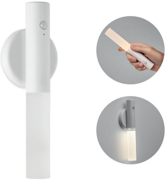 Vészhelyzeti és/vagy mozgásérzékelős, rögzíthető zseblámpa ABS-ből és akrilból, mágneses tartóval. Beépített 300 mAh-s újratölthető akkumulátorral és töltőkábellel. A tartó a mellékelt 3M matricával falra rögzíthető.