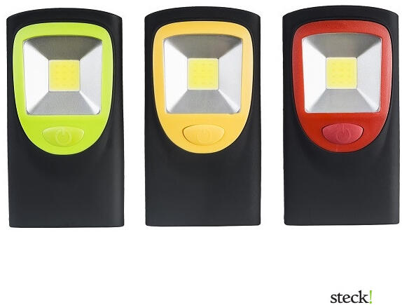 3W COB LED lámpa, 3x AAA elemmel (tartozék), 110 lm fényerővel és 3 m hatótávolsággal. ABS anyagból készült, 3 színben (piros, sárga, zöld), 9 db/doboz, gyártó: steck!